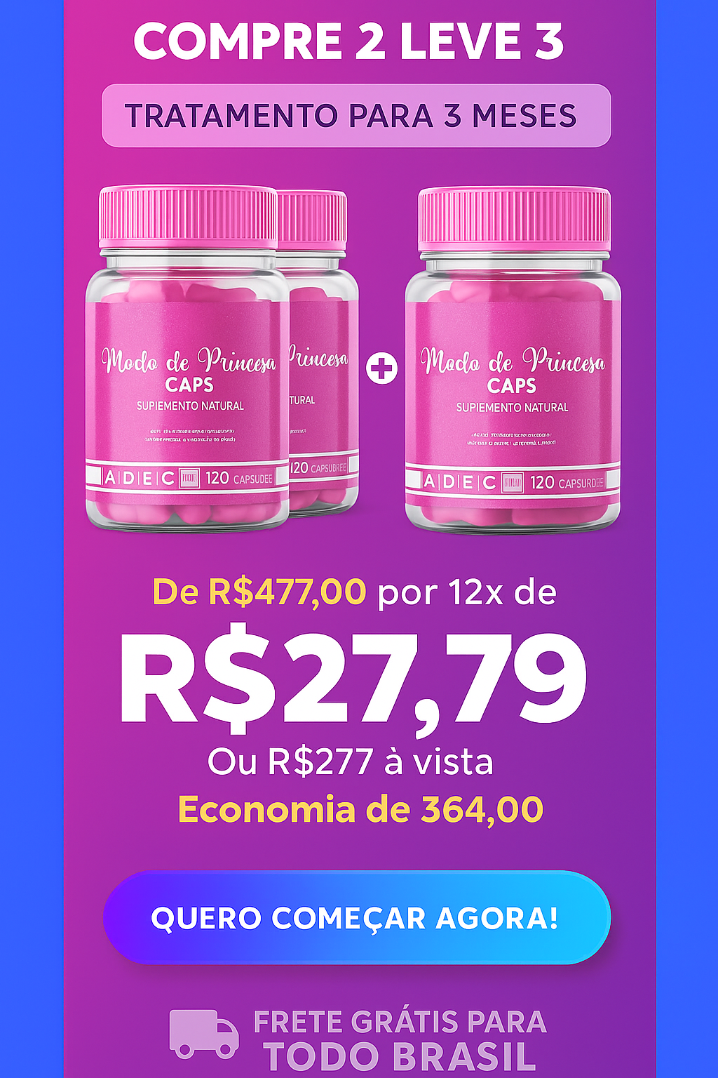 Princesa caps deve ser tomado diariamente, 2 comprimidos por dia, preferencialmente 01 logo após o café da manhã e outro antes de dormir. Recomendamos o uso por no mínimo 3 meses para um resultado surpreendente e definitivo.